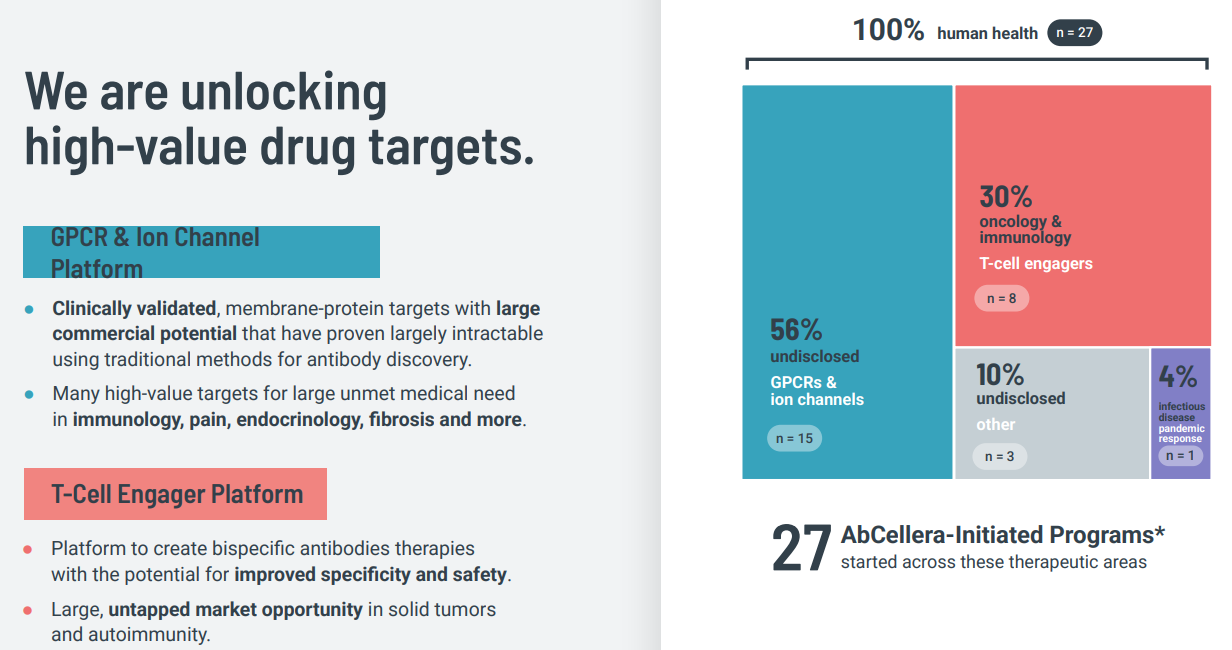 • T-Cell Engager Platform: Focuses on bispecific antibodies for solid tumors and autoimmunity, with the potential for improved safety and specificity. These platforms enable AbCellera to access targets in areas such as pain, fibrosis, and endocrinology that were previously considered largely inaccessible.