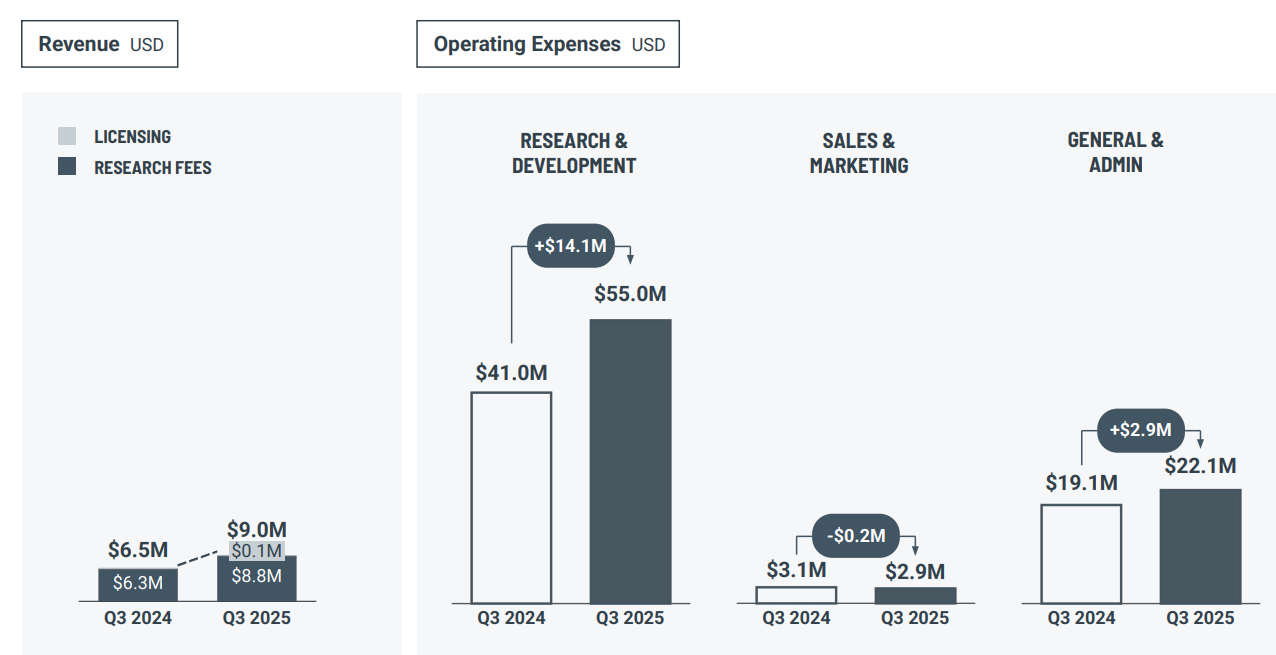 • Revenue Performance: Third-quarter revenue increased to $8.8 million (compared to $6.3 million in the prior-year quarter), primarily driven by research fees and licensing.