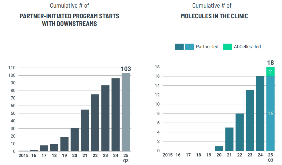 The partner-initiated portfolio continues to grow steadily, reaching a cumulative 103 program launches in the third quarter of 2025. The number of molecules in clinical trials increased to a total of 18, with two programs now under the direct management of AbCellera, while 16 remain under partner leadership.