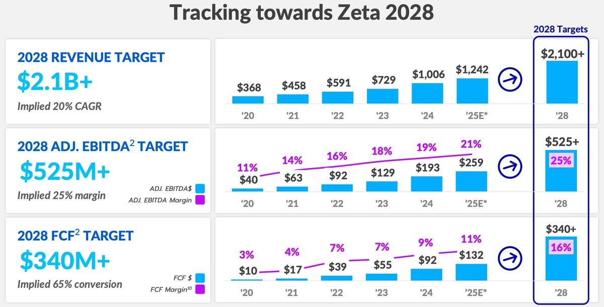 Zeta Global continues to deliver strong results, significantly increasing both revenue and profitability. In addition, Zeta Global has outlined a plan through 2028, based on a projected compound annual growth rate (CAGR) of 20%.