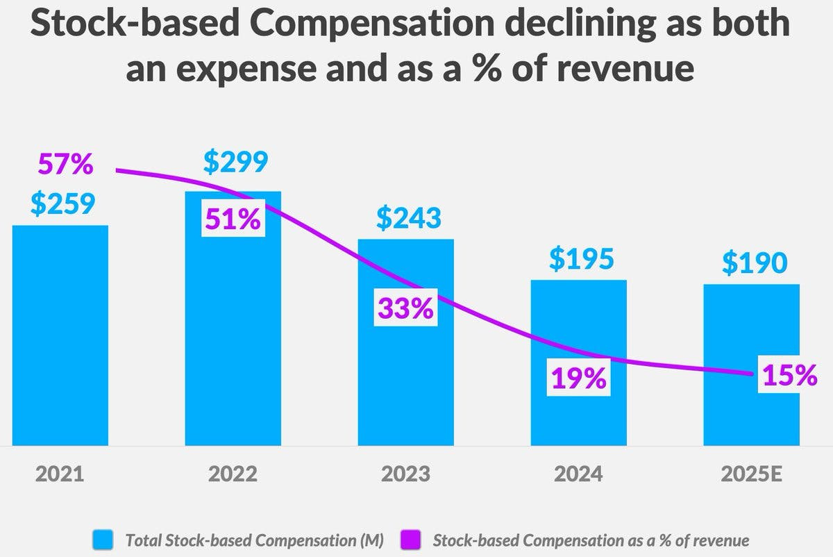 Stock-based compensation is decreasing, indicating improved cost discipline and reduced shareholder dilution.