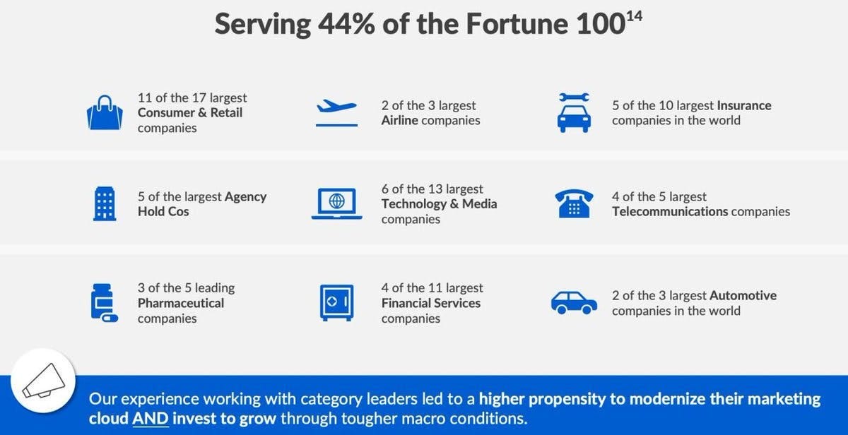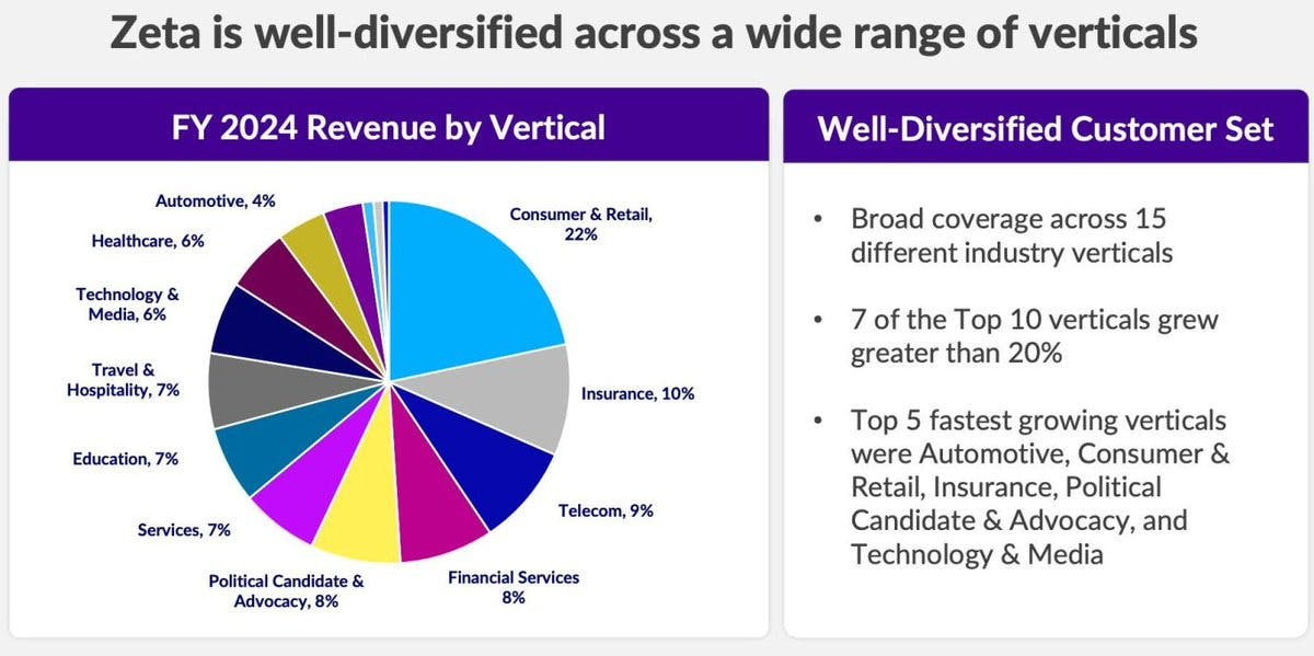 In my opinion, Zeta is in a unique position: With clients from a wide range of industries, Zeta Global has built a solid market position. The company serves customers across more than 15 different sectors and currently works with 44% of the Fortune 100 companies.