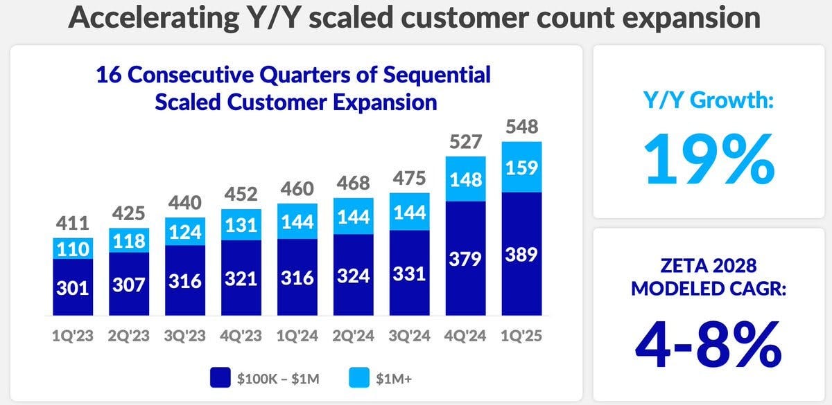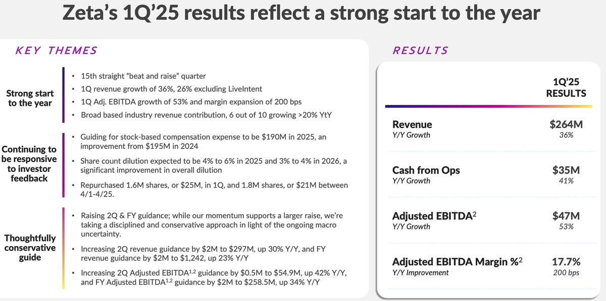 Zeta exceeded expectations for the 15th consecutive quarter and raised its forecasts for the second quarter and full year 2025.